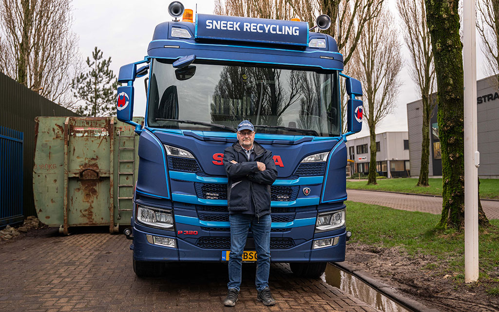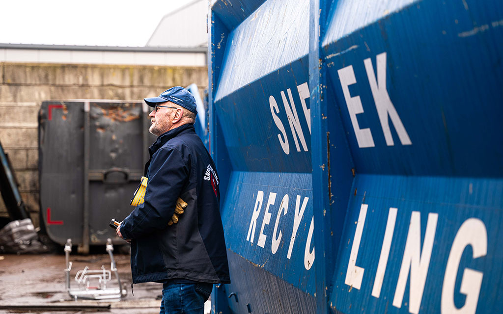 Pake werkt sinds een jaar of 4 bij Sneek Recycling. Hij rijdt op de portaalwagen om de gehuurde containers te bezorgen en op te halen. Wie een container bestelt op donderdag, vrijdag of zaterdag heeft de grootste kans hem tegen te komen. “Soms werk ik wat extra”, vertelt Pake, “maar eigenlijk is 3 dagen wel genoeg voor mij. Het voelt als een hobby. Dat buitenwerk vind ik gewoon mooi. Geen dag is hetzelfde. Je komt steeds weer op andere plekken. Veel in Sneek natuurlijk, maar ook daarbuiten.”